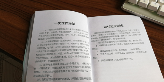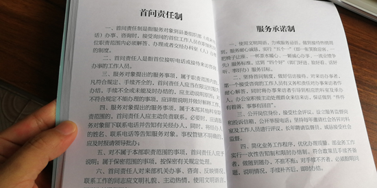 制度規(guī)定,服務對象到縣委組織部辦事、咨詢或來電時,首個接待的工作人員必須熱情、禮貌、耐心接待辦理或引領交給相關職責科室辦理。凡符合規(guī)定,手續(xù)齊全的,限時辦結(jié),手續(xù)不全未能及時辦結(jié)的,要主動向服務對象說明原因……縣委組織部常務副部長薛斌告訴記者:“通過扎牢制度的籠子,讓部機關工作人員做到一張笑臉迎客,一把椅子讓座,一杯茶水暖心,一顆誠心辦事,一流業(yè)績爭先的服務標準,切實達到門好進、臉好看、話好聽,事好辦的目的?!?/p>