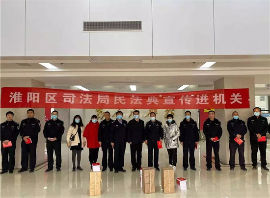 活動中,淮陽區(qū)司法局副局長楊仲杰同志帶領(lǐng)普法小分隊走進淮陽區(qū)公安局,將《民法典》學(xué)習(xí)讀本送到了廣大公安干警的手中。干警們對司法局“送法進機關(guān)”活動非常歡迎,一致認(rèn)為在《中華人民共和國民法典》即將實施之際,學(xué)習(xí)《民法典》是非常有必要的,有利于增強大家遇事找法、解決問題靠法的意識。