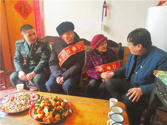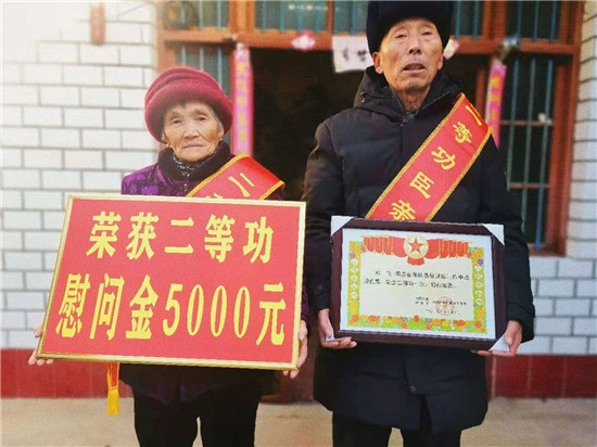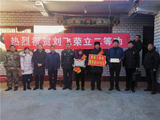 近日,周口市淮陽區(qū)人武部與區(qū)退役軍人事務(wù)局相關(guān)領(lǐng)導(dǎo),來到該區(qū)四通鎮(zhèn)孔北行政村劉莊村,為在部隊榮立二等功的現(xiàn)役軍人劉飛的父母送去立功喜報,并送上慰問品及慰問金。臨走,劉飛的父親劉啟來說:“請領(lǐng)導(dǎo)放心,俺會讓孩子在部隊更加安心服役,力爭取得更大成績,多為家鄉(xiāng)增光添彩。”(張然 張雙斌 攝影報道)