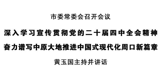 會(huì)議強(qiáng)調(diào),要把學(xué)習(xí)宣傳貫徹黨的二十屆四中全會(huì)精神,作為各級(jí)黨委(黨組)理論學(xué)習(xí)中心組集體學(xué)習(xí)的重要內(nèi)容,納入黨校(行政學(xué)院)教育培訓(xùn)的必修課程,做到黨員干部全覆蓋;各級(jí)宣傳部門(mén)要充分利用各種形式和手段,做好權(quán)威解讀和分眾化傳播,讓廣大黨員干部群眾聽(tīng)得懂、記得住、落實(shí)在行動(dòng)上;要把貫徹落實(shí)全會(huì)精神與習(xí)近平總書(shū)記在河南考察時(shí)重要講話(huà)精神緊密結(jié)合起來(lái),聚焦“兩高四著力”,錨定“1+2+4+N”目標(biāo)任務(wù)體系,落實(shí)市委“16232”總體工作思路,突出抓好重點(diǎn)項(xiàng)目建設(shè)和招商引資、農(nóng)業(yè)農(nóng)村、城市規(guī)劃建設(shè)管理、文旅發(fā)展、民生實(shí)事、社會(huì)治理等重點(diǎn)工作,全力以赴打贏“十四五”收官戰(zhàn),高質(zhì)量編制“十五五”規(guī)劃,切實(shí)把全會(huì)部署轉(zhuǎn)化為推動(dòng)現(xiàn)代化周口建設(shè)的實(shí)際行動(dòng)。